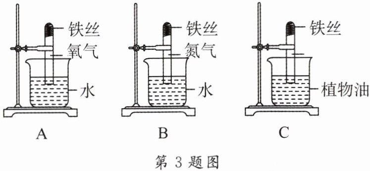 3. 如图装置可探究铁制品锈蚀的条件。一周后,$B$、$C$中无明显现象,$A$中可观察到的现象是______、______。实验证明,铁制品锈蚀主要是铁与空气中的______共同作用的结果。