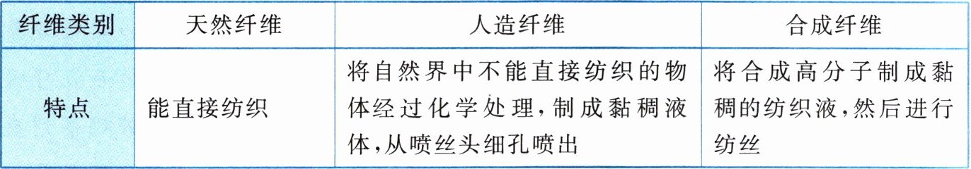 |特点|能直接纺织|将自然界中不能直接纺织的物体经过化学处理,制成黏稠液体,从喷丝头细孔喷出|将合成高分子制成黏稠的纺织液,然后进行纺丝|
