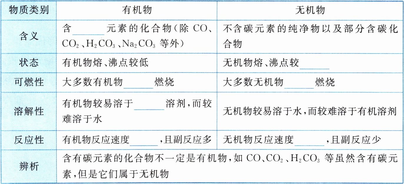 |含义|含______元素的化合物(除${CO}$、${CO_{2}}$、${H_{2}CO_{3}}$、${Na_{2}CO_{3}}$等外)|不含碳元素的纯净物以及部分含碳化合物|