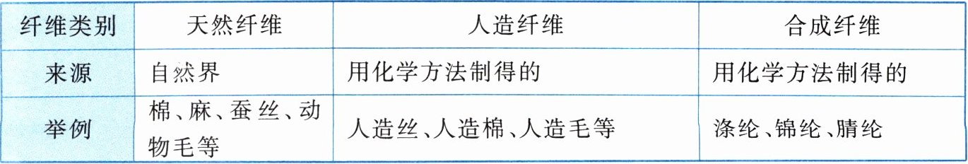 |举例|棉、麻、蚕丝、动物毛等|人造丝、人造棉、人造毛等|涤纶、锦纶、腈纶|