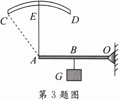 3. 如图所示,圆弧形轨道 $ CD $ 固定,水平杠杆 $ OA $ 的 $ A $ 端恰在圆的圆心处,小圆环 $ E $ 套在轨道上通过细线与水平杆的 $ A $ 端相连,一重物 $ G $ 悬挂在杠杆上的 $ B $ 点。在 $ E $ 环从 $ C $ 点沿轨道顺时针转到 $ D $ 点的过程中,细线对 $ A $ 端的拉力 $ F $ 的变化情况,下列说法正确的是( )