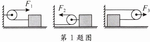 1. 如图所示的三个滑轮分别拉同一物体沿同一水平地面做匀速直线运动,所用的拉力分别为 $ F_{1} $,$ F_{2} $,$ F_{3} $,那么,下列关系式中正确的是( )
