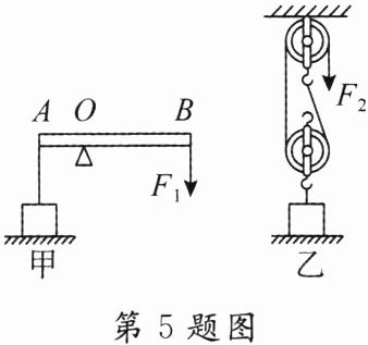 5. 建筑工人利用如图所示的两种方式,将重均为 400N 的材料从图示位置向上缓慢提升 0.5m。$ F_{1} $、$ F_{2} $ 始终沿竖直方向。图甲中 $ OB = 2OA $,图乙中动滑轮重为 40N,重物上升速度为 $ 0.2m/s $。不计杠杆重、绳重和摩擦,则下列说法正确的是( )