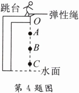 4. 如图所示为蹦极运动的简化示意图,弹性绳一端系在运动员双脚上,另一端固定在跳台$O$点。运动员由静止开始自由下落,$A$点处弹性绳正好处于原长;$B$点处运动员受到的重力与弹性绳对运动员的拉力大小相等;$C$点处是蹦极运动员到达的最低点。(整个过程中忽略空气阻力,弹性绳的自重不计)
