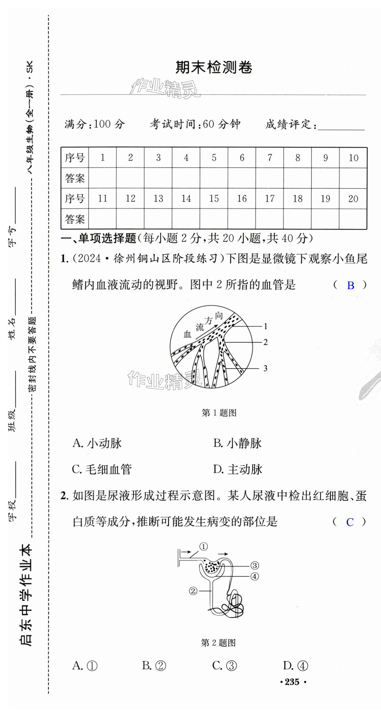 注:目前有些书本章节名称可能整理的还不是很完善,但都是按照顺序排列的,请同学们按照顺序仔细查找。练习册 2024年启东中学作业本八年级生物全一册苏科版 答案主要是用来给同学们做完题方便对答案用的,请勿直接抄袭。