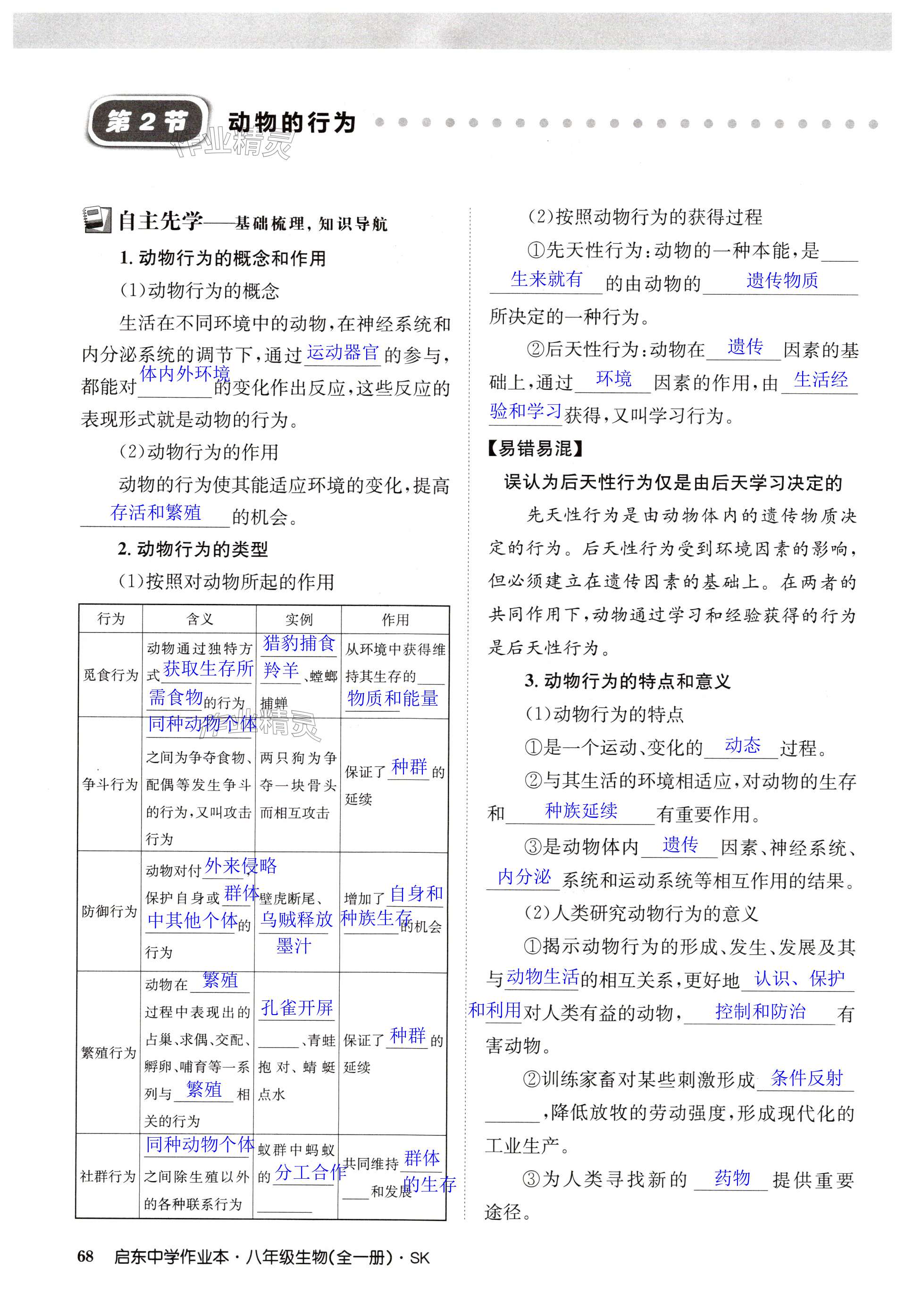 注:目前有些书本章节名称可能整理的还不是很完善,但都是按照顺序排列的,请同学们按照顺序仔细查找。练习册 2024年启东中学作业本八年级生物全一册苏科版 答案主要是用来给同学们做完题方便对答案用的,请勿直接抄袭。