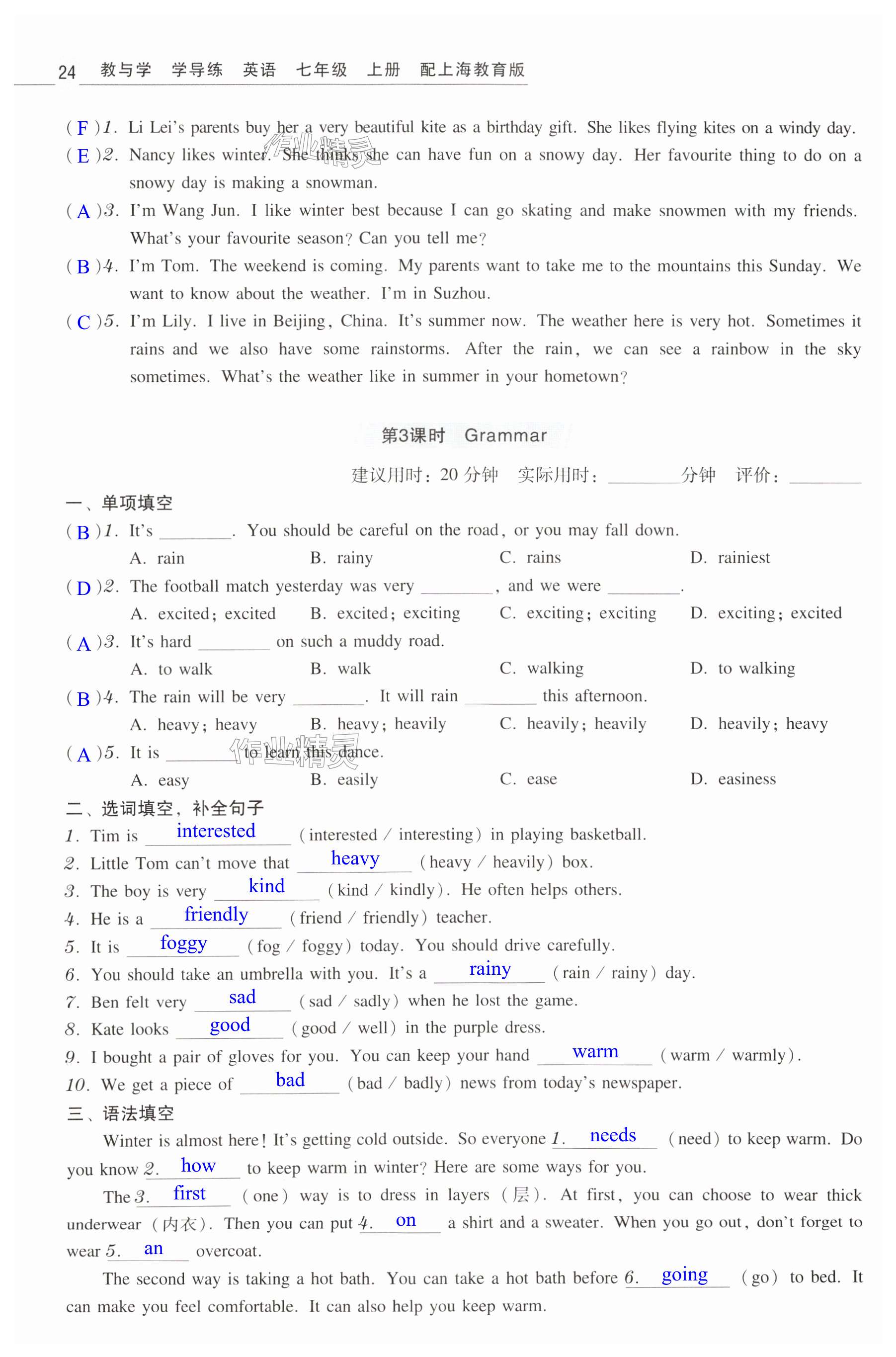 注:目前有些书本章节名称可能整理的还不是很完善,但都是按照顺序排列的,请同学们按照顺序仔细查找。练习册 2024年教与学学导练七年级英语上册沪教版 答案主要是用来给同学们做完题方便对答案用的,请勿直接抄袭。