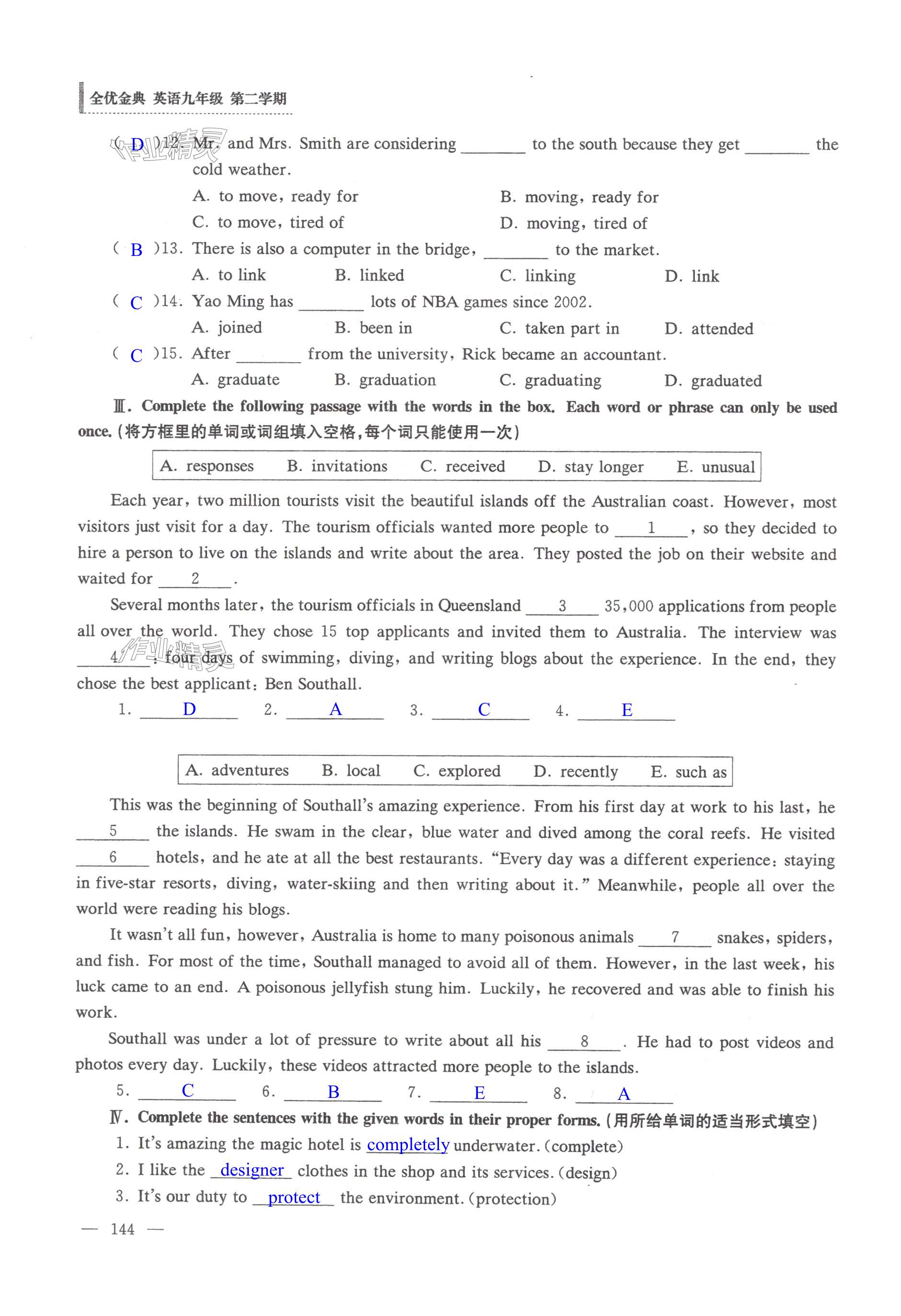 注:目前有些书本章节名称可能整理的还不是很完善,但都是按照顺序排列的,请同学们按照顺序仔细查找。练习册 2024年全优金典九年级英语全一册沪教版54制 答案主要是用来给同学们做完题方便对答案用的,请勿直接抄袭。