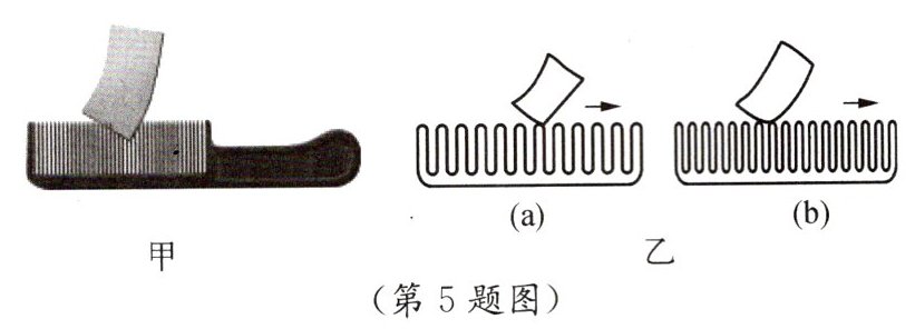 5. 如图甲所示,用薄塑料片在塑料梳子的齿上划两次,第一次快些,第二次慢些,则第____次发出的声音的音调高;如果第二次划齿的力量较大,则第____次发出的声音较响。如图乙所示,用薄塑料片在(a)、(b)两把塑料梳子的齿上用同样的速度划两次,则梳子____发出声音的音调高。