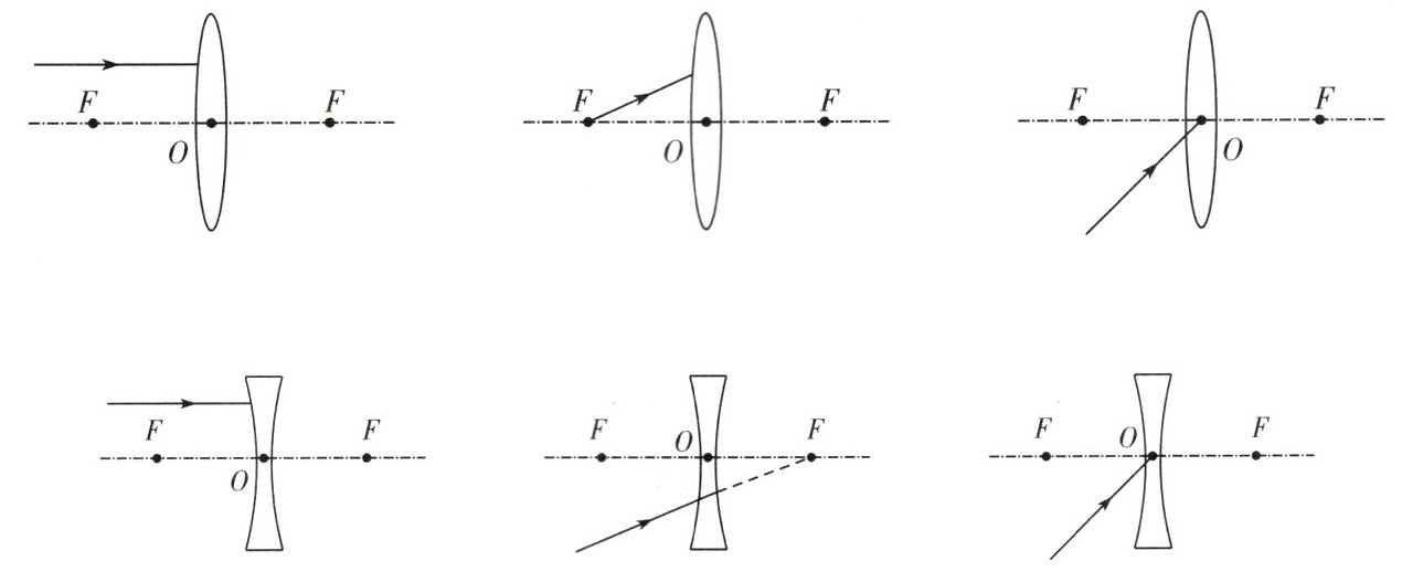 平行于主光轴的光经凸透镜折射后,会聚在主光轴上的点叫做焦点,焦点到凸透镜光心的距离叫做焦距,凸透镜两侧各有一个焦点。平行于主光轴的光经凹透镜折射后发散,折射光线的反向延长线会聚在主光轴的点叫做焦点,凹透镜也有两个焦点。
