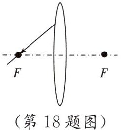18. 如图所示,是经过凸透镜折射后的一条出射光线,请你在图中画出对应的入射光线。
