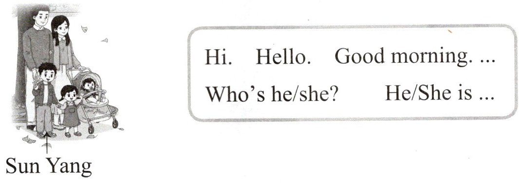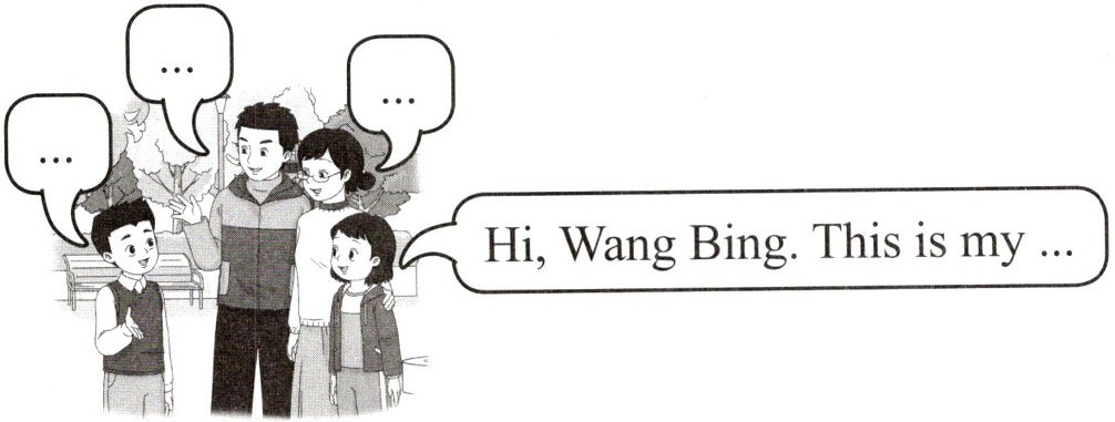 假设图中的小男孩是你的朋友孙洋,你在公园遇到他和他的家人,你们会展开什么样的对话?请根据下面的句型提示设计一段对话,并和同学一起演一演。
