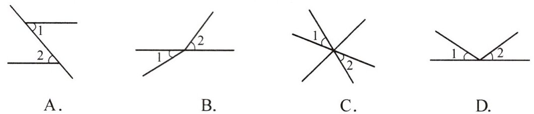 1. 下列各图中,$∠1与∠2$是对顶角的是( )