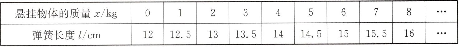 |悬挂物体的质量x/kg|0|1|2|3|4|5|6|7|8|...|