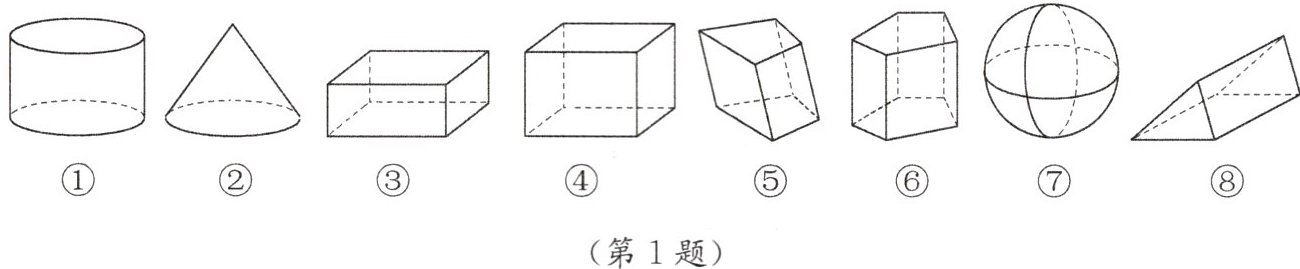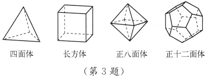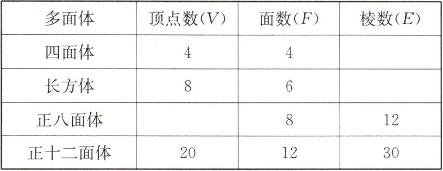 3. 18世纪,瑞士数学家欧拉证明了简单多面体中顶点数(V)、面数(F)、棱数(E)之间存在一个有趣的关系式——欧拉公式.观察如图所示的几种简单多面体模型,回答问题.