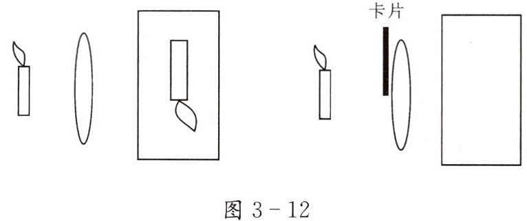 如图3-12所示,蜡烛通过凸透镜成像在光屏上。如果透镜的上半部被一张卡片挡住,还能成像吗?如果能成像,试在光屏上画出你认为的像的形状并用实验加以证实。