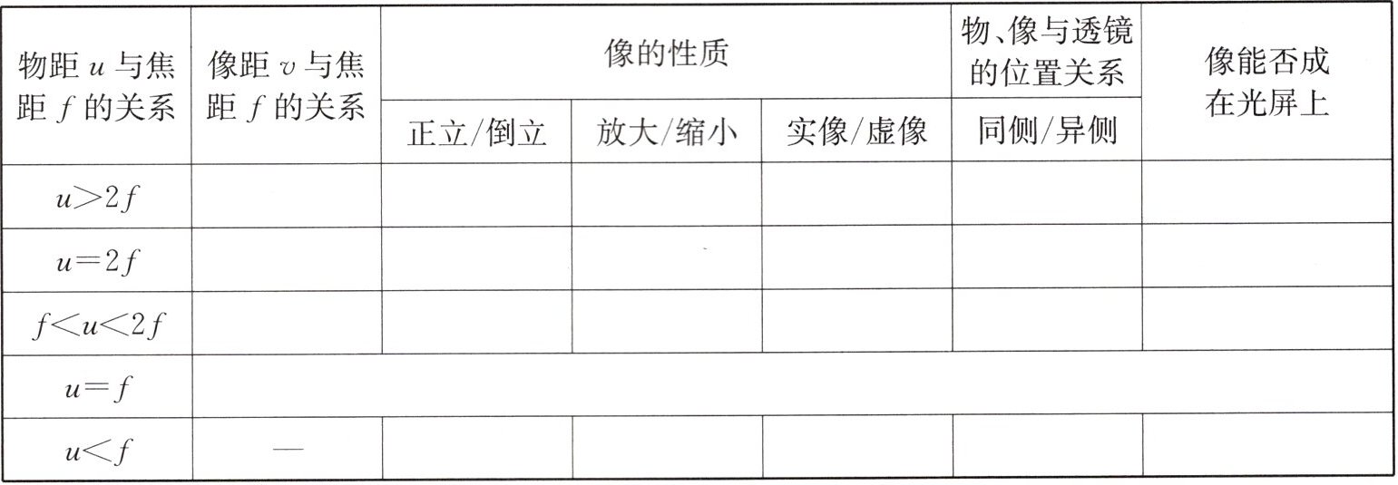 | $u>2f$ | | 正立/倒立 | 放大/缩小 | 实像/虚像 | 同侧/异侧 | |