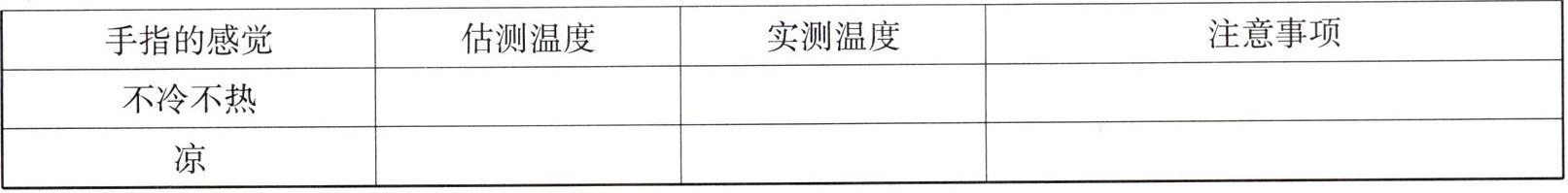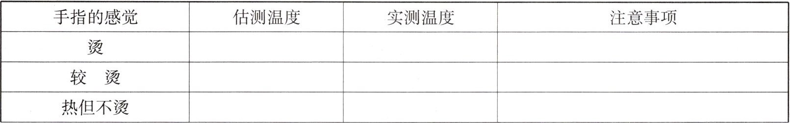 点 拨 操作过程中,注意不要引起烫伤。当手指能忍受热水温度时再伸入水中,根据手指在水中的不同感觉进行水温估测,并用语言把感觉描述出来。实际测量水的温度时,要注意温度计的正确使用并正确读数。操作过程中要留心注意事项,并及时记录下来。下面的表格供你设计时参考。