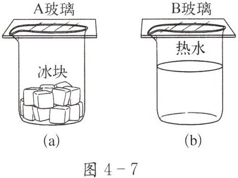 8. 常温下,两个烧杯分别盛有冰块和热水,如图 4 - 7 所示。两烧杯上方均盖有一块玻璃,过一会儿会看到( )。