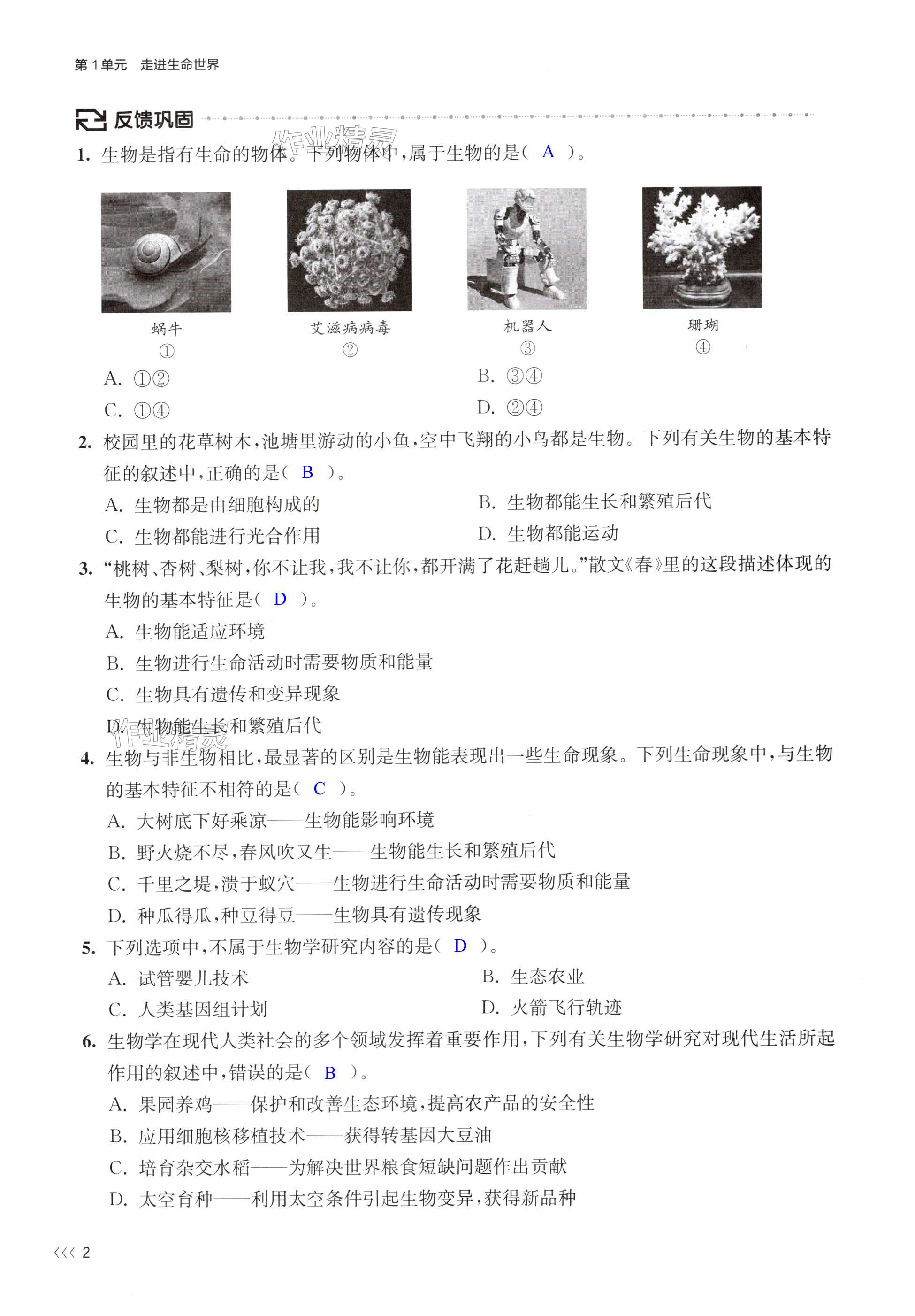 注:目前有些书本章节名称可能整理的还不是很完善,但都是按照顺序排列的,请同学们按照顺序仔细查找。练习册 2024年同步练习江苏七年级生物上册苏科版 答案主要是用来给同学们做完题方便对答案用的,请勿直接抄袭。