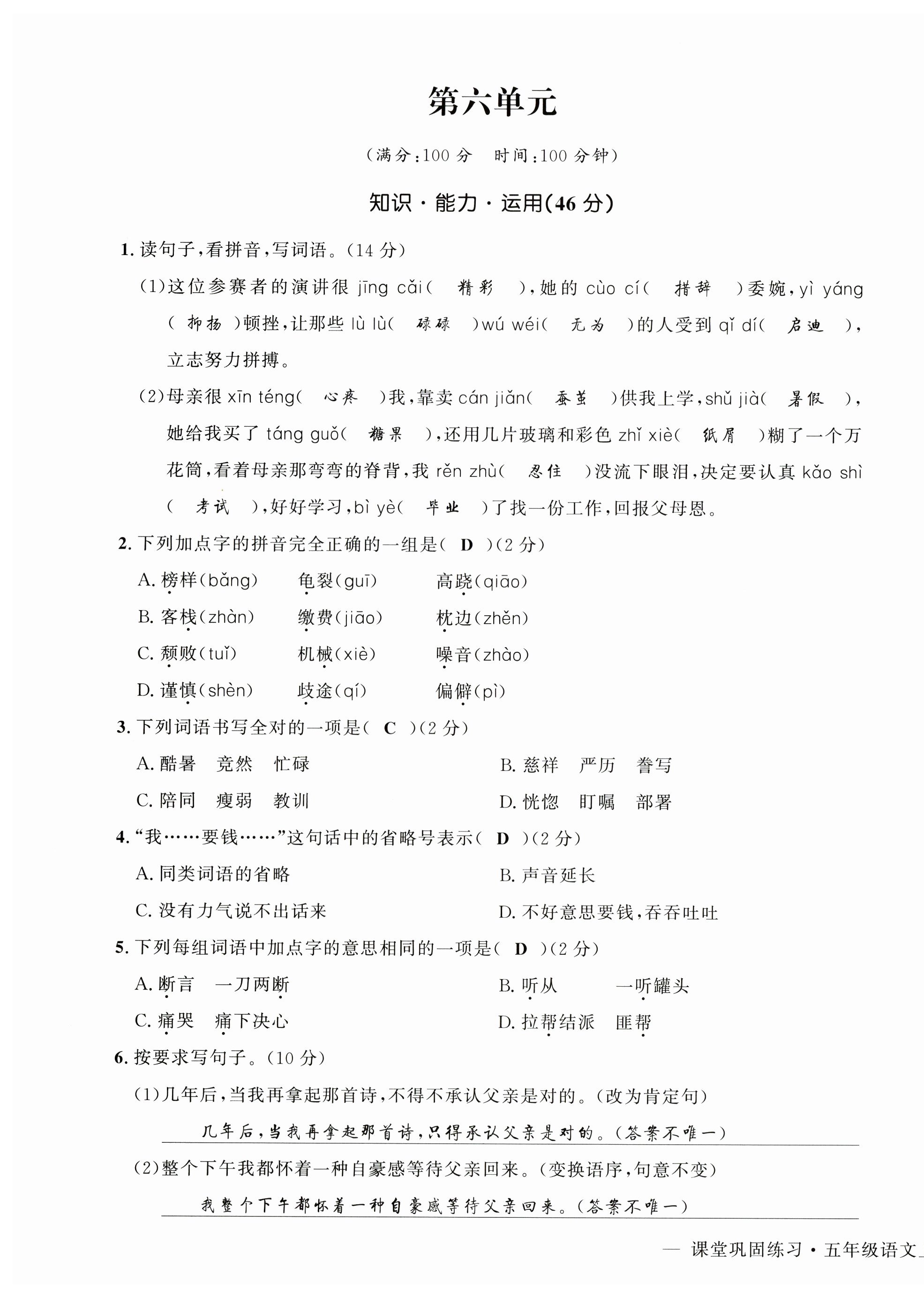 注:目前有些书本章节名称可能整理的还不是很完善,但都是按照顺序排列的,请同学们按照顺序仔细查找。练习册 2024年课堂巩固练习五年级语文上册人教版 答案主要是用来给同学们做完题方便对答案用的,请勿直接抄袭。