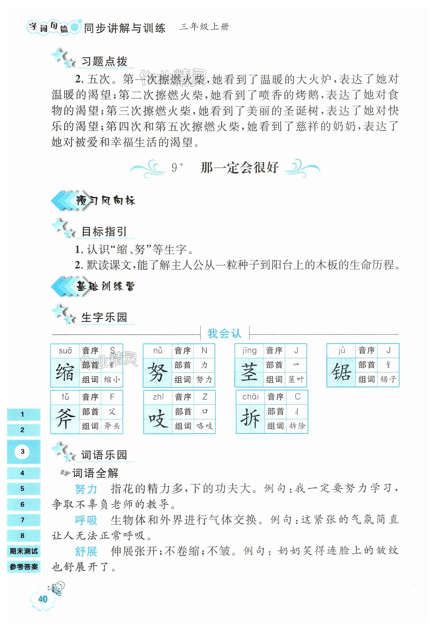 注:目前有些书本章节名称可能整理的还不是很完善,但都是按照顺序排列的,请同学们按照顺序仔细查找。练习册 2024年字词句篇同步讲解与训练三年级语文上册人教版 答案主要是用来给同学们做完题方便对答案用的,请勿直接抄袭。