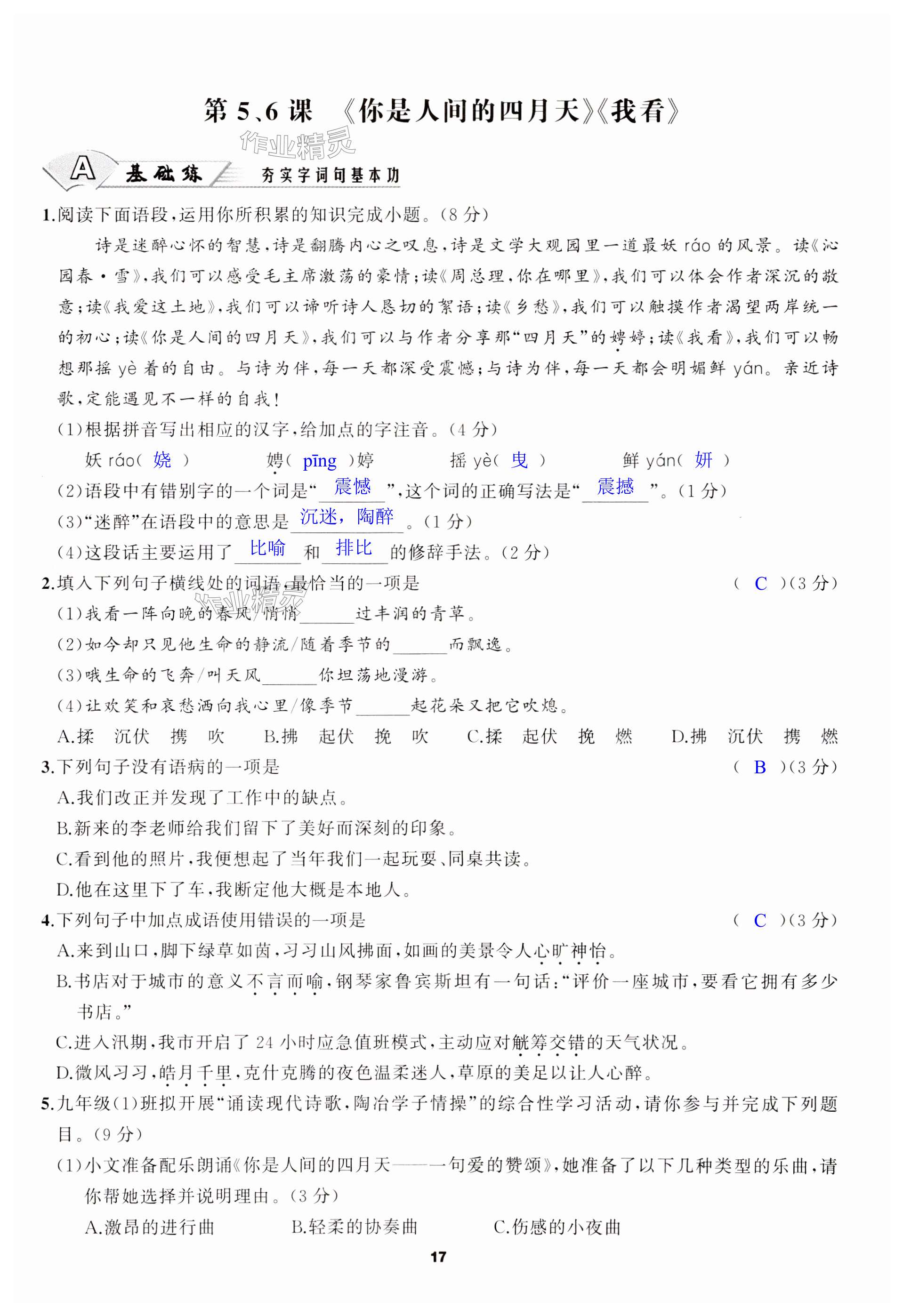 注:目前有些书本章节名称可能整理的还不是很完善,但都是按照顺序排列的,请同学们按照顺序仔细查找。练习册 2024年语文花开天津科学技术出版社九年级语文全一册人教版湖北专版 答案主要是用来给同学们做完题方便对答案用的,请勿直接抄袭。