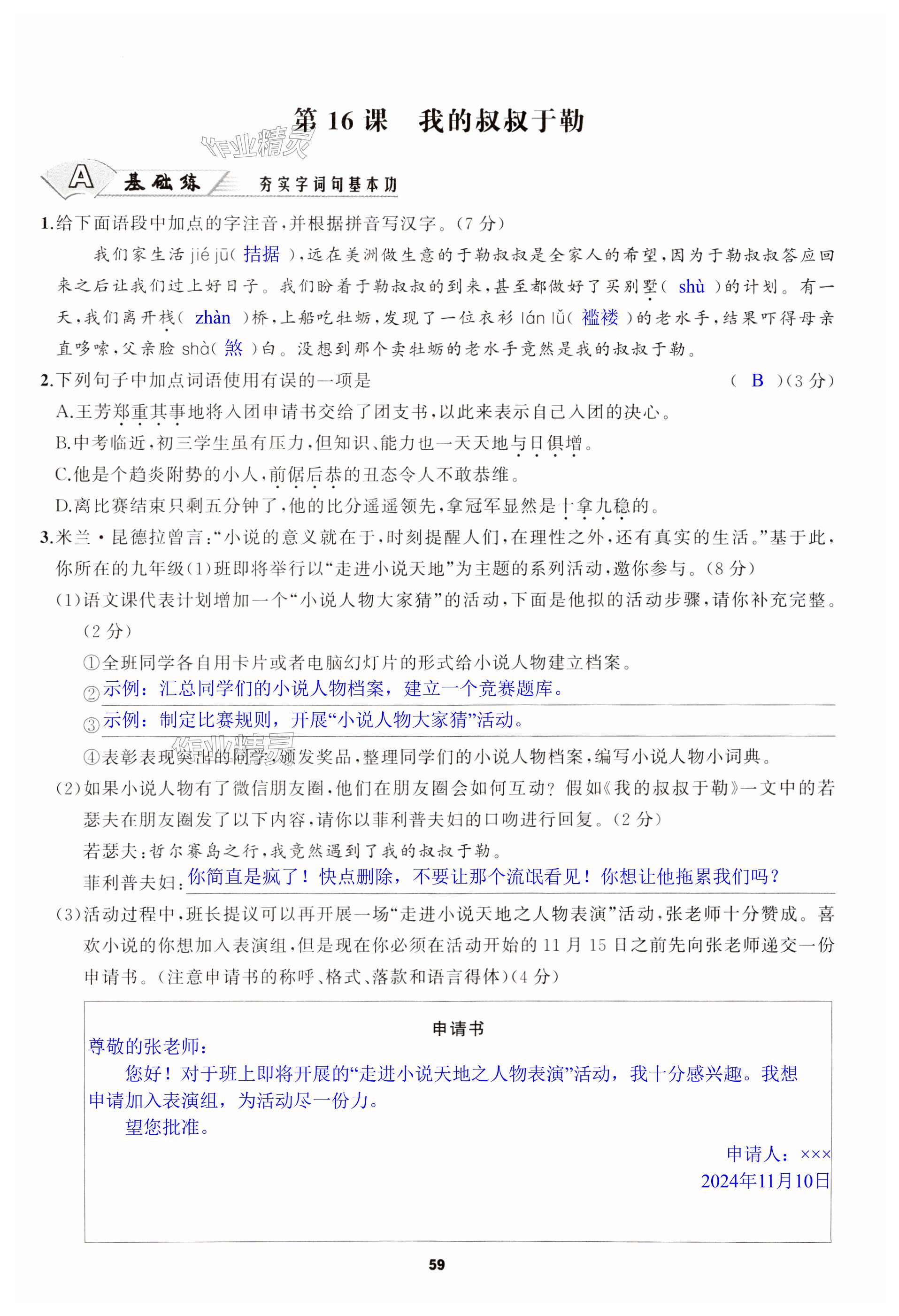 注:目前有些书本章节名称可能整理的还不是很完善,但都是按照顺序排列的,请同学们按照顺序仔细查找。练习册 2024年语文花开天津科学技术出版社九年级语文全一册人教版湖北专版 答案主要是用来给同学们做完题方便对答案用的,请勿直接抄袭。