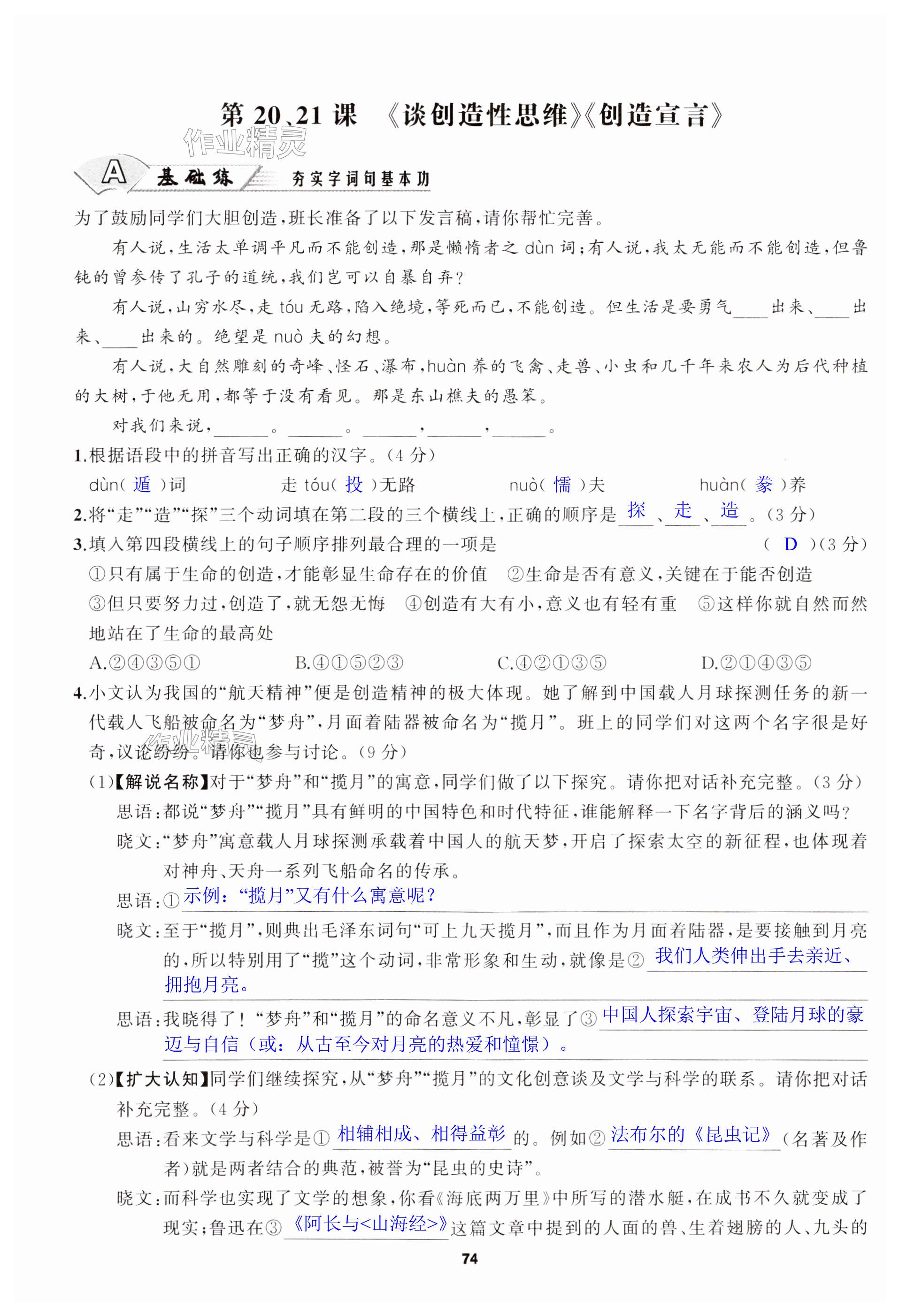 注:目前有些书本章节名称可能整理的还不是很完善,但都是按照顺序排列的,请同学们按照顺序仔细查找。练习册 2024年语文花开天津科学技术出版社九年级语文全一册人教版湖北专版 答案主要是用来给同学们做完题方便对答案用的,请勿直接抄袭。