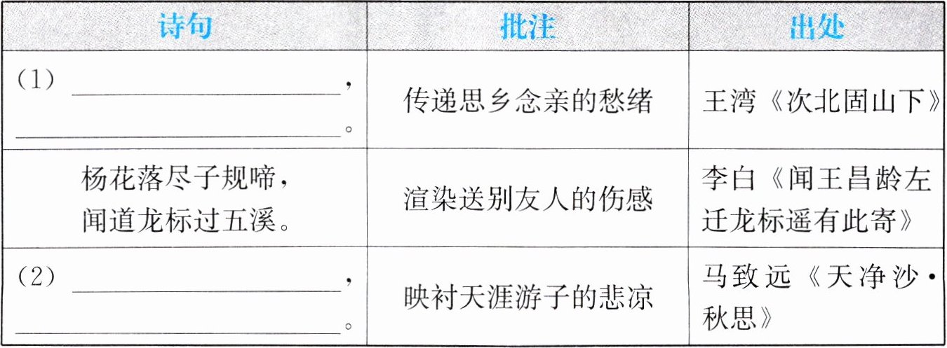 | (1)______,______。 | 传递思乡念亲的愁绪 | 王湾《次北固山下》 |