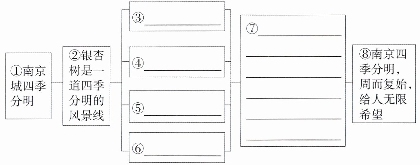 | ①南京城四季分明 | ②银杏树是一道四季分明的风景线 | ③______ | ④______ | ⑤______ | ⑥______ | ⑦______ | ⑧南京四季分明,周而复始,给人无限希望 |