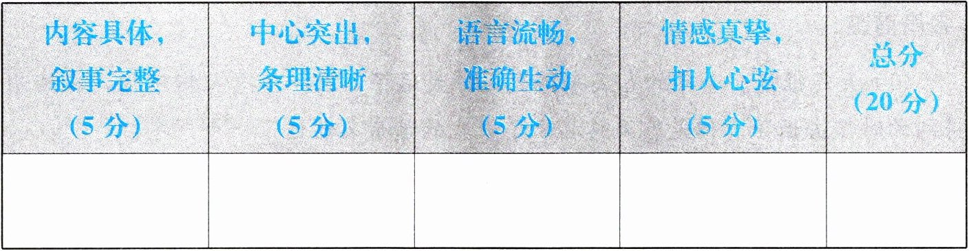 | 内容具体,叙事完整(5分) | 中心突出,条理清晰(5分) | 语言流畅,准确生动(5分) | 情感真挚,扣人心弦(5分) | 总分(20分) |