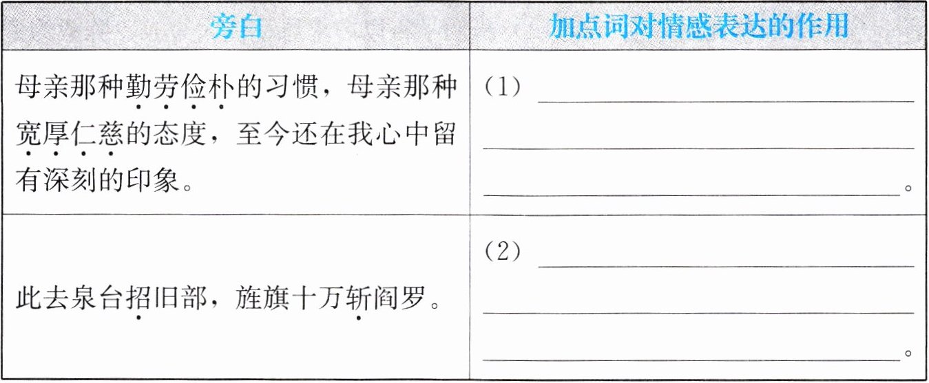 2.【定旁白】一个好的旁白能够提升短视频的质量。同学们围绕如何利用旁白更好地表达情感展开了讨论,有同学认为可以抓住句子中富有感情色彩的词语。如果将下面两句话作为旁白,请分析加点的关键词对情感表达的作用。(4分)