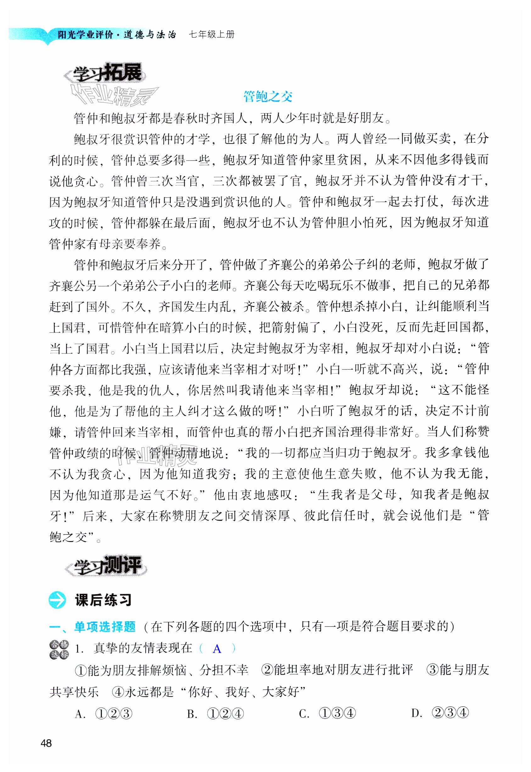 注:目前有些书本章节名称可能整理的还不是很完善,但都是按照顺序排列的,请同学们按照顺序仔细查找。练习册 2024年阳光学业评价七年级道德与法治上册人教版 答案主要是用来给同学们做完题方便对答案用的,请勿直接抄袭。