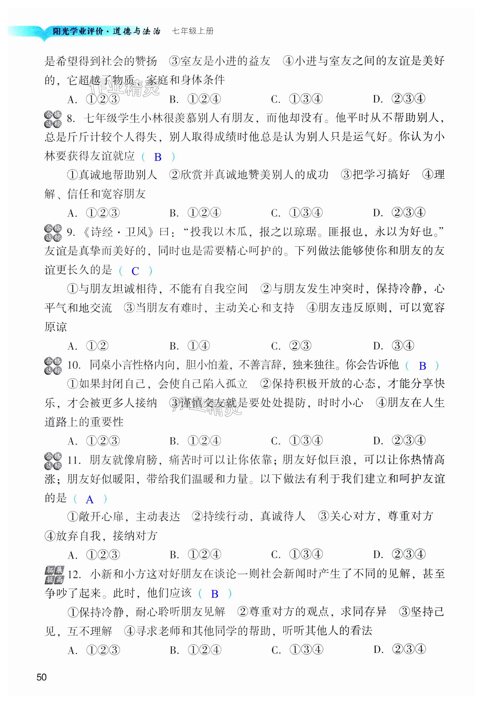 注:目前有些书本章节名称可能整理的还不是很完善,但都是按照顺序排列的,请同学们按照顺序仔细查找。练习册 2024年阳光学业评价七年级道德与法治上册人教版 答案主要是用来给同学们做完题方便对答案用的,请勿直接抄袭。