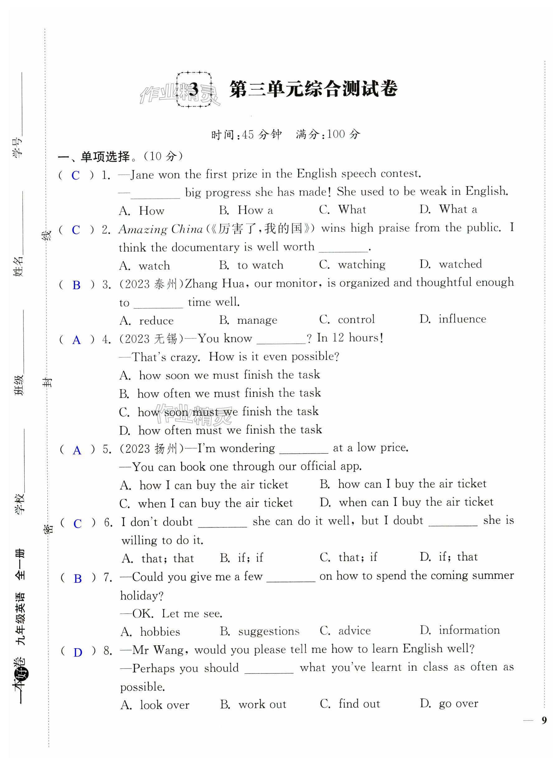 注:目前有些书本章节名称可能整理的还不是很完善,但都是按照顺序排列的,请同学们按照顺序仔细查找。练习册 2024年一本好卷九年级英语全一册译林版 答案主要是用来给同学们做完题方便对答案用的,请勿直接抄袭。