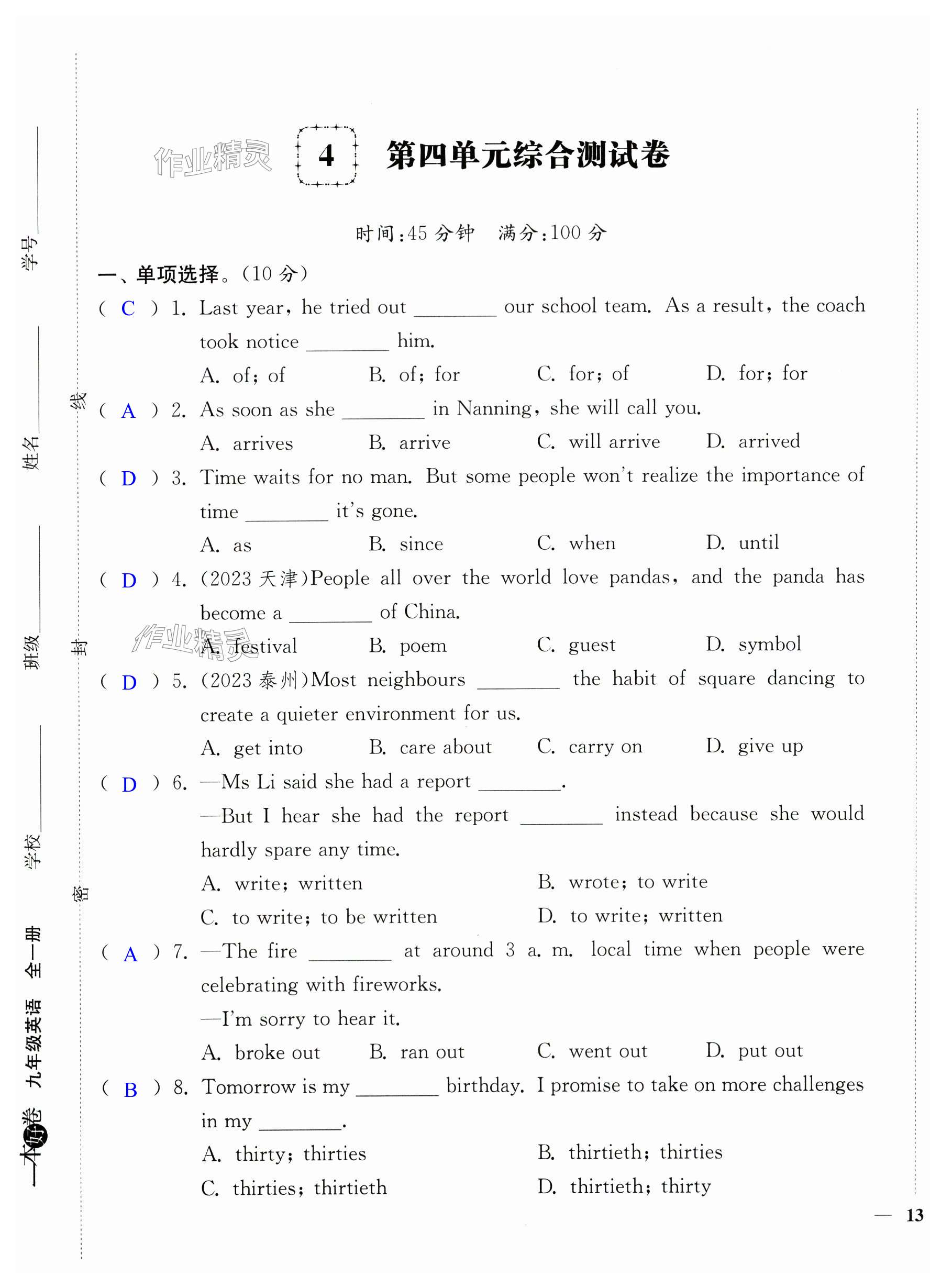 注:目前有些书本章节名称可能整理的还不是很完善,但都是按照顺序排列的,请同学们按照顺序仔细查找。练习册 2024年一本好卷九年级英语全一册译林版 答案主要是用来给同学们做完题方便对答案用的,请勿直接抄袭。