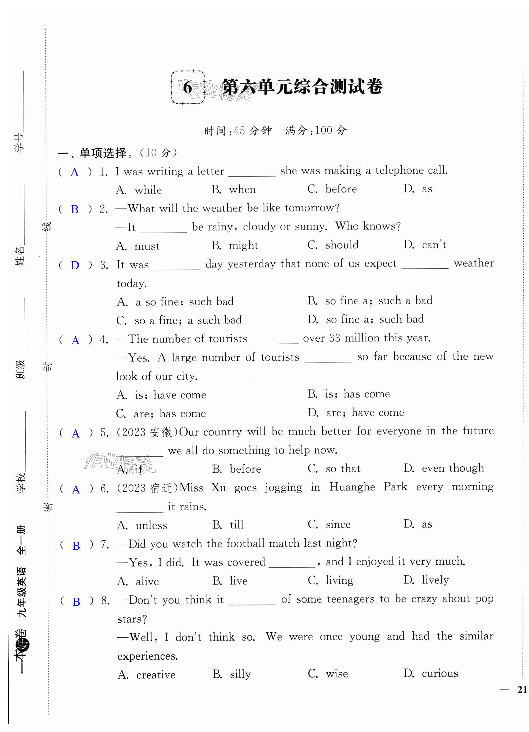 注:目前有些书本章节名称可能整理的还不是很完善,但都是按照顺序排列的,请同学们按照顺序仔细查找。练习册 2024年一本好卷九年级英语全一册译林版 答案主要是用来给同学们做完题方便对答案用的,请勿直接抄袭。