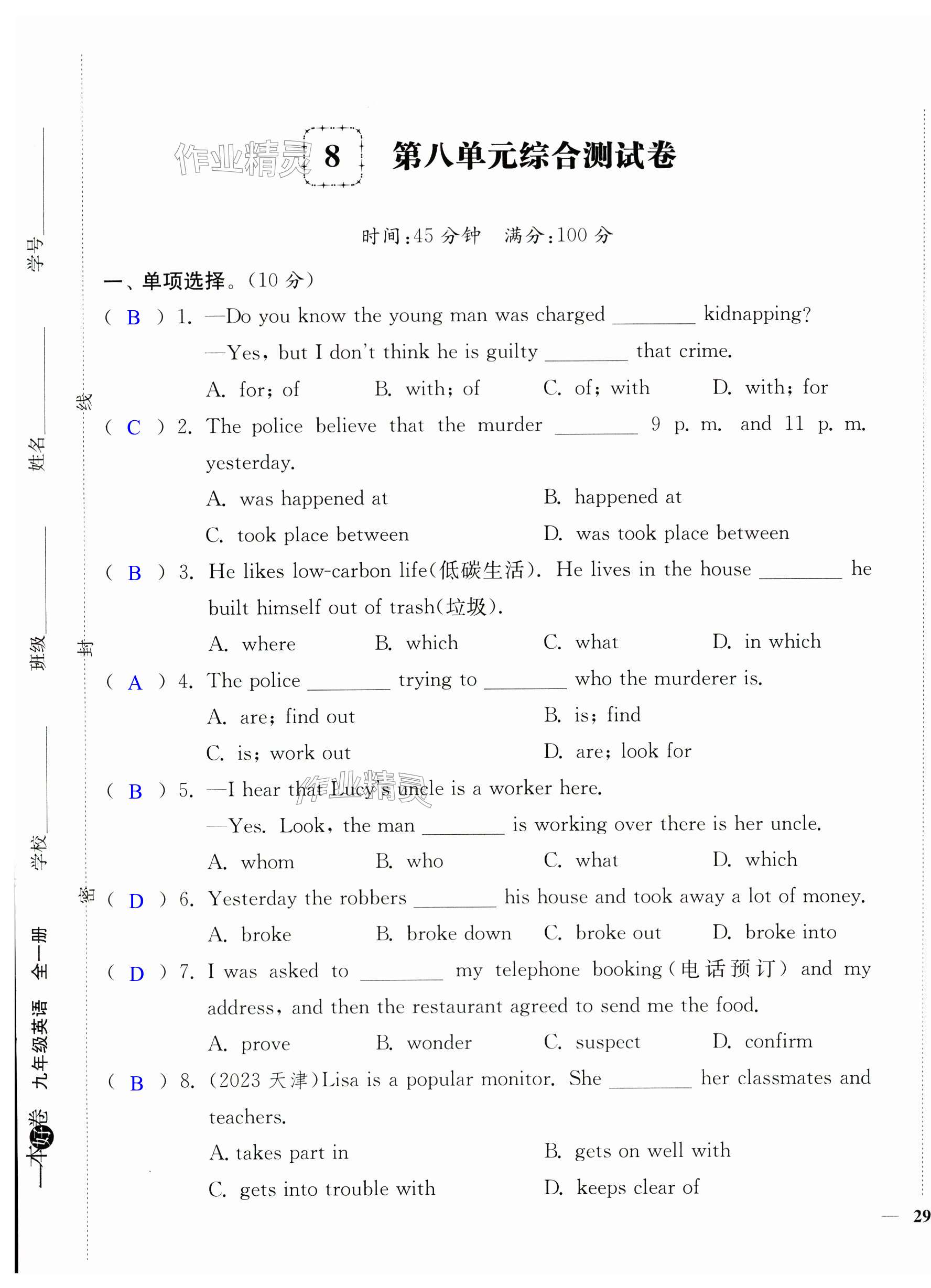 注:目前有些书本章节名称可能整理的还不是很完善,但都是按照顺序排列的,请同学们按照顺序仔细查找。练习册 2024年一本好卷九年级英语全一册译林版 答案主要是用来给同学们做完题方便对答案用的,请勿直接抄袭。