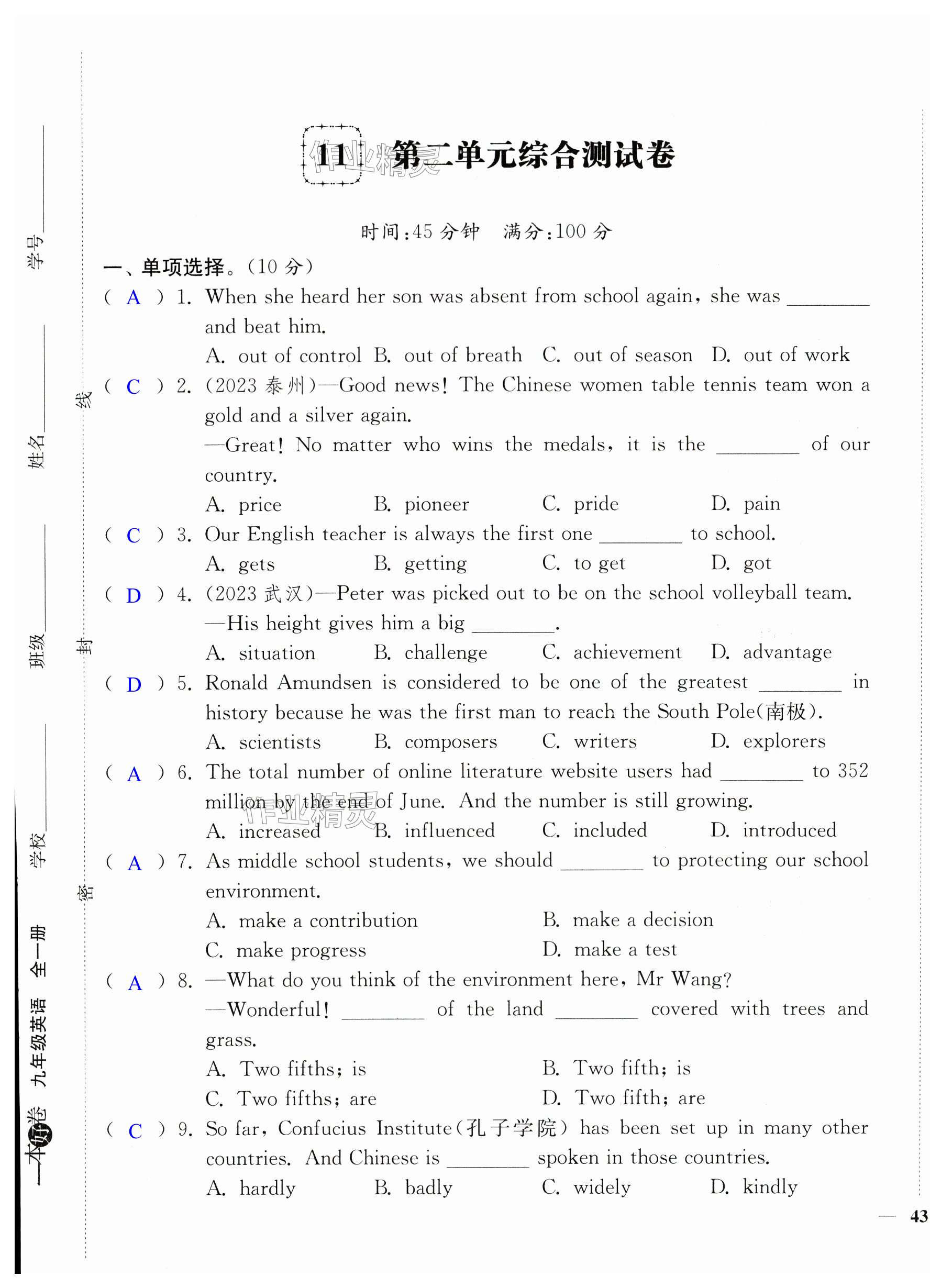 注:目前有些书本章节名称可能整理的还不是很完善,但都是按照顺序排列的,请同学们按照顺序仔细查找。练习册 2024年一本好卷九年级英语全一册译林版 答案主要是用来给同学们做完题方便对答案用的,请勿直接抄袭。