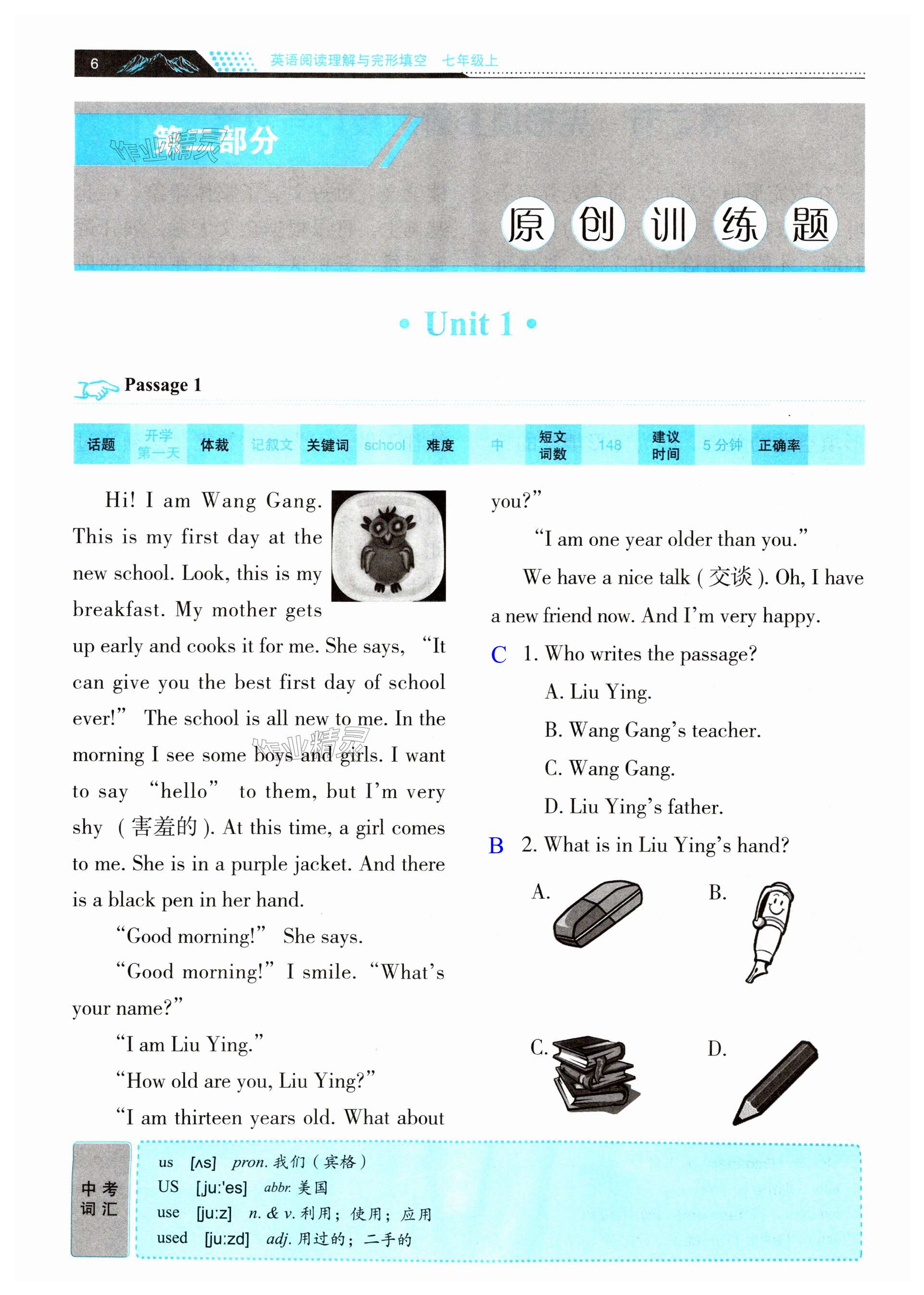 注:目前有些书本章节名称可能整理的还不是很完善,但都是按照顺序排列的,请同学们按照顺序仔细查找。练习册 2024年初中英语阅读理解与完形填空江苏人民出版社七年级上册 答案主要是用来给同学们做完题方便对答案用的,请勿直接抄袭。