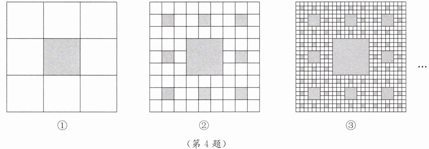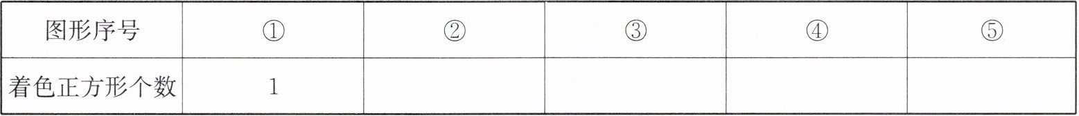 4. 如图,将图①的正方形等分为9个小正方形,并对中间的小正方形进行着色,再将图①中没有着色的小正方形重复以上操作得到图②,以此类推.在表格中填写各图形中所有着色正方形的个数.