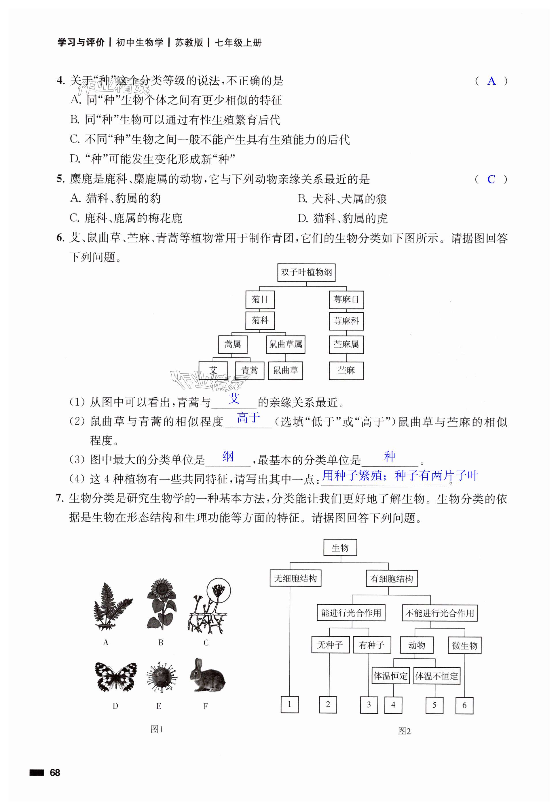 注:目前有些书本章节名称可能整理的还不是很完善,但都是按照顺序排列的,请同学们按照顺序仔细查找。练习册 2024年学习与评价江苏凤凰教育出版社七年级生物上册苏教版江苏专版 答案主要是用来给同学们做完题方便对答案用的,请勿直接抄袭。