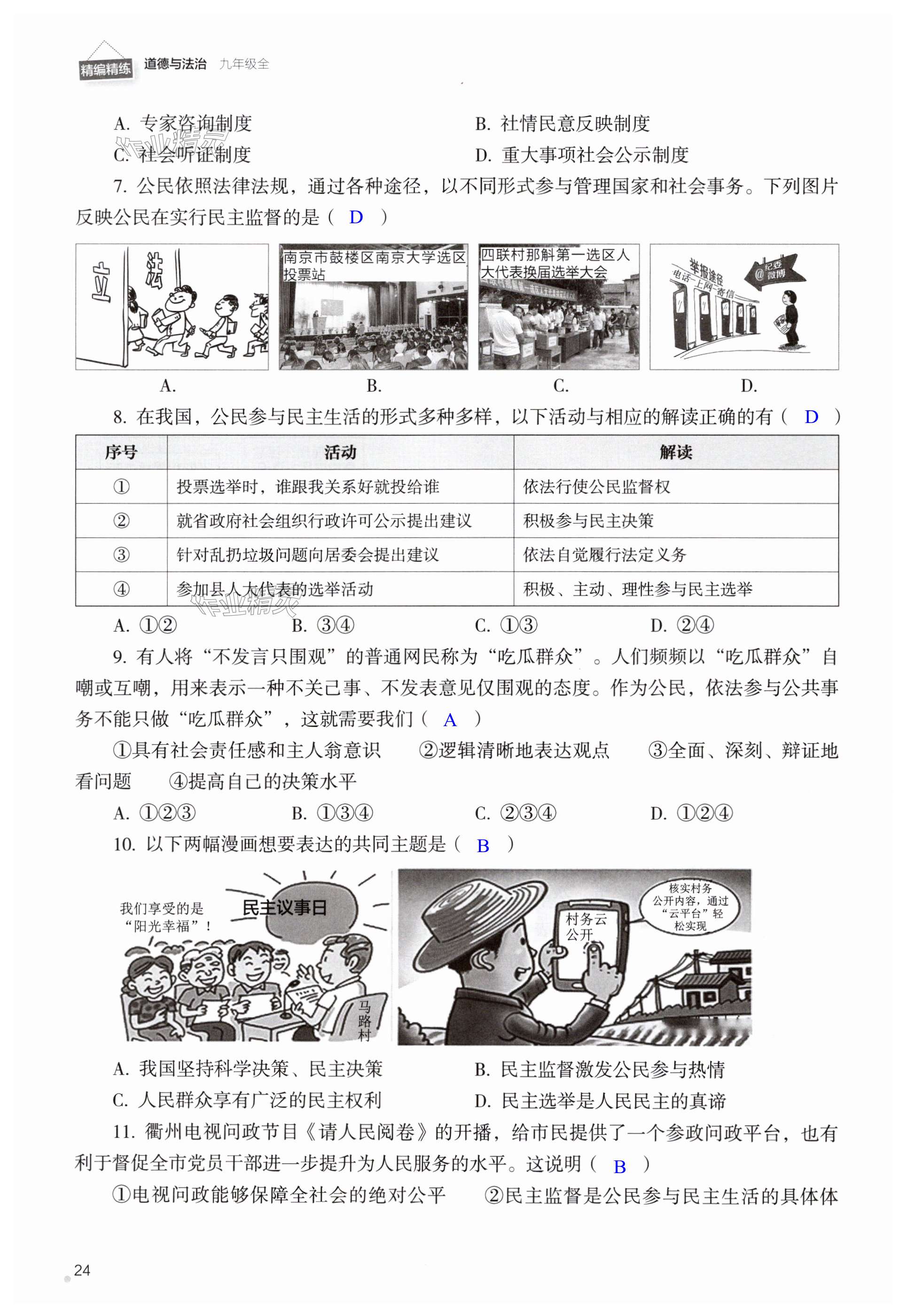 注:目前有些书本章节名称可能整理的还不是很完善,但都是按照顺序排列的,请同学们按照顺序仔细查找。练习册 2024年精编精练浙江教育出版社九年级道德与法治全一册人教版 答案主要是用来给同学们做完题方便对答案用的,请勿直接抄袭。