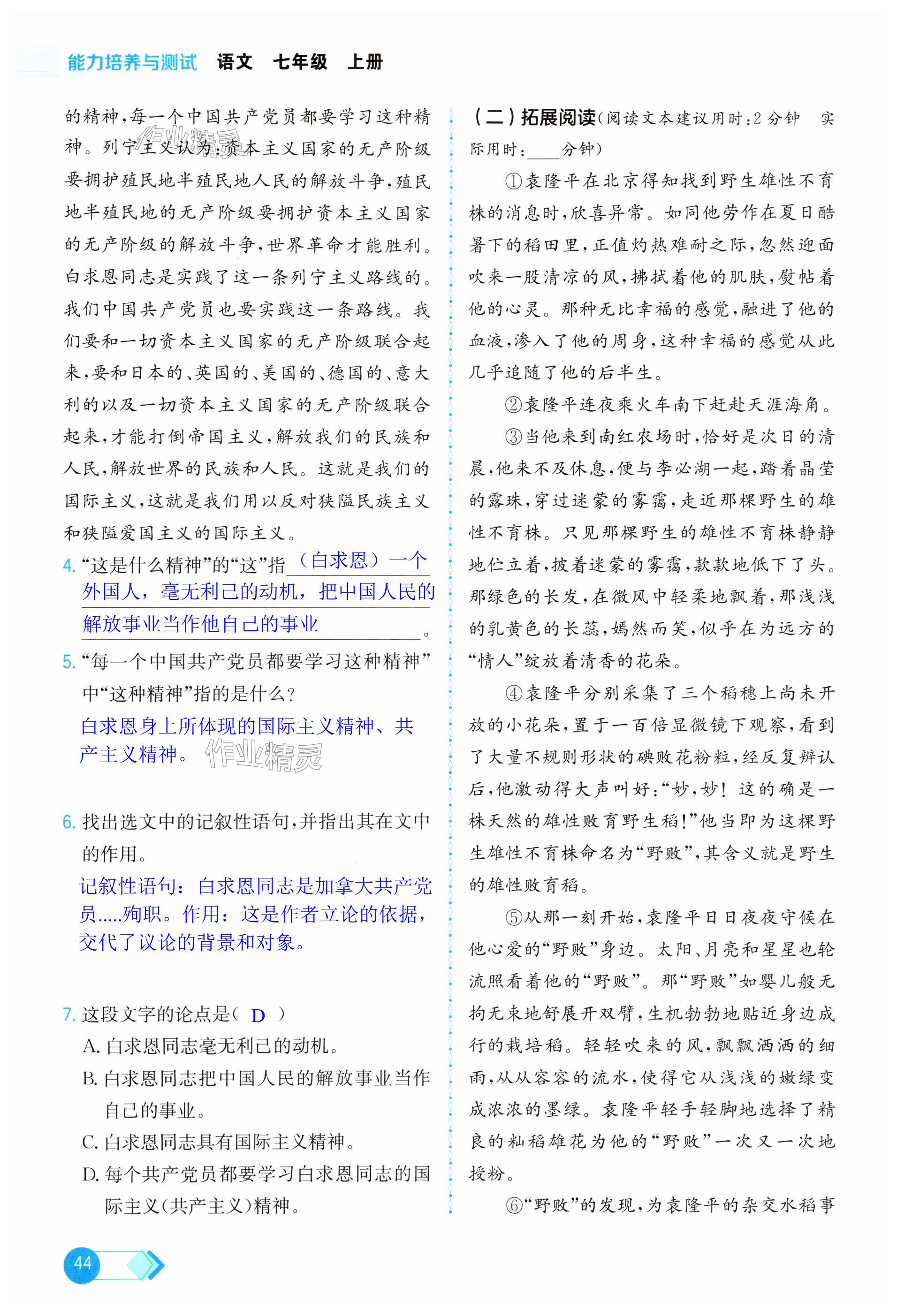 注:目前有些书本章节名称可能整理的还不是很完善,但都是按照顺序排列的,请同学们按照顺序仔细查找。练习册 2024年能力培养与测试七年级语文上册人教版湖南专版 答案主要是用来给同学们做完题方便对答案用的,请勿直接抄袭。