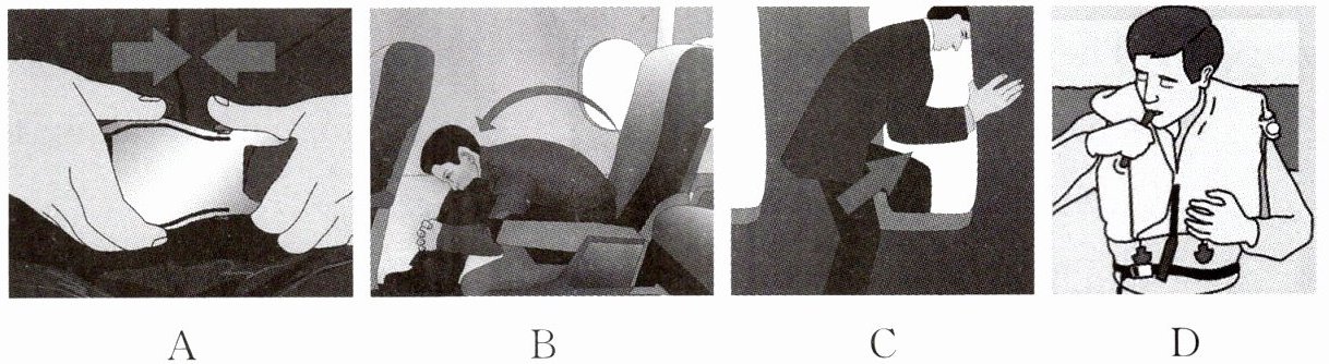 ( )3. Put the mask on your face! Bend forward and put your chest on your legs and your head between your knees. Cross your hands and hold your ankles(脚踝). Place your legs under the seat as far as possible to avoid breaking your bones.
