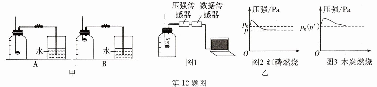 (2) 乙同学用图乙中图1装置测定空气中氧气的含量。图2、图3是用该装置测得的红磷和木炭分别在集气瓶中燃烧的压强一时间关系图(该装置气密性良好,$p_{0}$是集气瓶内初始气压,p和$p'$分别是反应结束后恢复到室温时集气瓶内的气压,已知相同条件下集气瓶中气体压强与气体所占体积成正比)。下列说法正确的是______(填字母)。