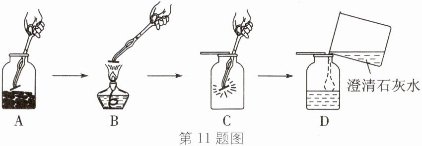 11. 如图所示是木炭在氧气中燃烧的实验操作,试回答下列问题。