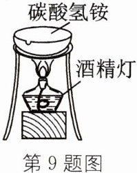 9. 取少量碳酸氢铵固体粉末放入蒸发皿中,将蒸发皿放在酒精灯上加热(如图所示)。碳酸氢铵是____色____态;从试剂瓶中取用碳酸氢铵所用的仪器是____;加热碳酸氢铵时,闻到一股____的气味,这是因为生成了____;放在蒸发皿上方的干冷玻璃片上出现了____,这是因为生成了____;同时还有使澄清石灰水变浑浊的气体生成,这种气体是____。