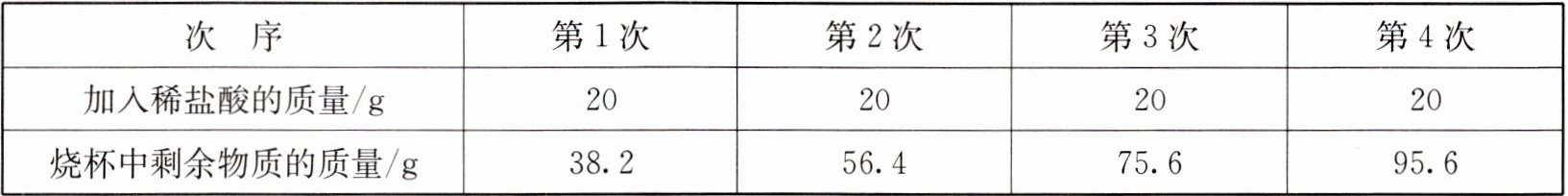|烧杯中剩余物质的质量$/g$|38.2|56.4|75.6|95.6|